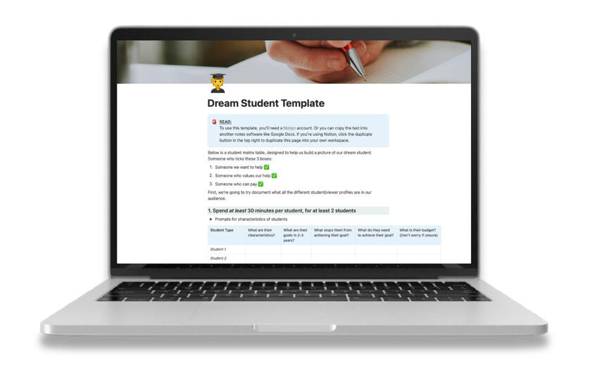 Download the Dream Student Template below to help you identify your dream student. That's someone you want to help, wants your help, and can pay. If they don't tick those boxes, you don't have a business.